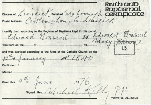 Normoyle - Born 1812 near Castle Mahon, Country Limerick, Ireland. Died
