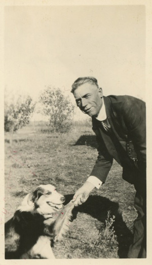 | Emery Kidwell and Carlo (Gallaher's dog) - 1920 | Cousins Flossie Kidwell (left) and Emery Kidwell (right) at Aunt Sarah Long's house near Juniata Nebr - 1920 |