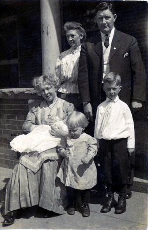 James Washington Sheehy and family. Margaret seated with baby Anthony Edmund, son James, and son John Rogers. Back of card reads "...James is getting ready to suck his thumb in this picture". The lady in the back is unidentified. |