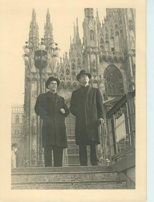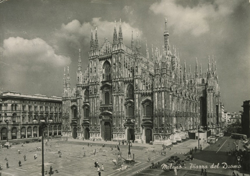 Based on the architecture of the building in the background, along with post cards having the same structure, it is believed this picture was taken on the grounds of the Duomo (Cathedral) in Milan. |