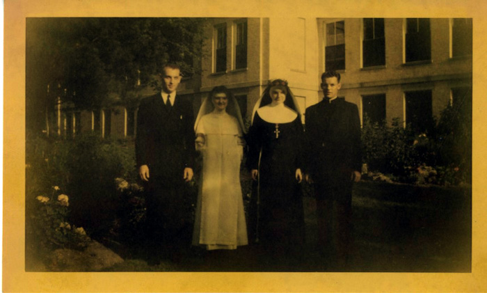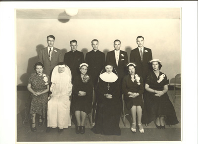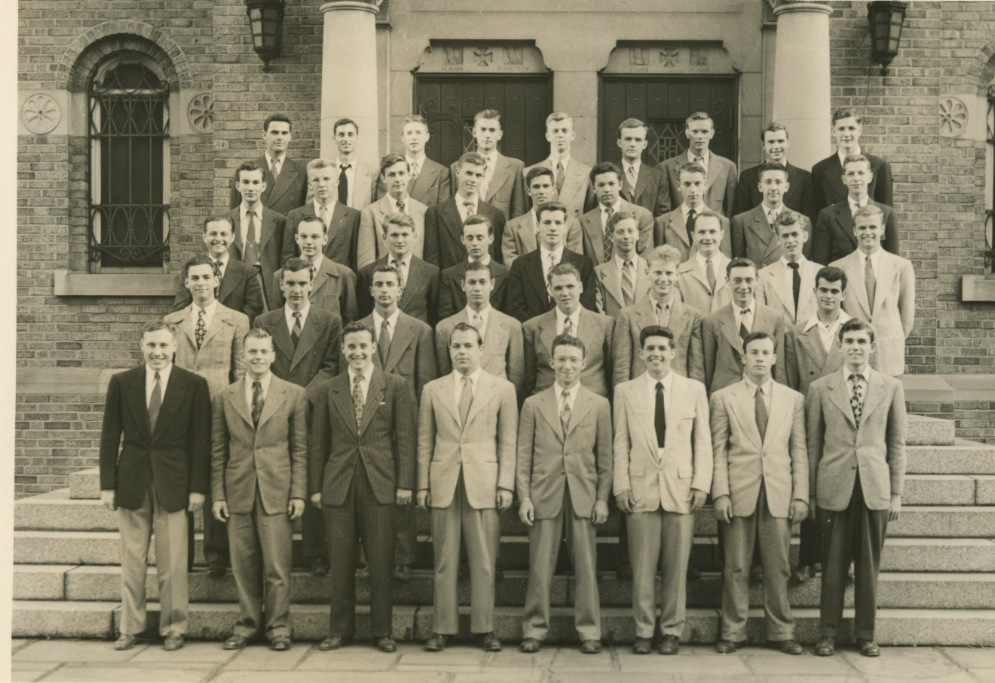 Paul in 2nd row from top, 3rd from the right. Msgr Ivan Vap is the second row down, the one on the left end. The picture was taken on the steps of the chapel at St. Louis Prep Seminary, the spring of 1947. |