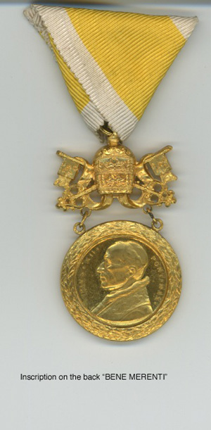 | The medal "Bene Merenti" was obtained for the parents of "native" Nebraska priests in the Lincoln Diocese. As the name states, it is given to "one who is well-deserving." (Information provided by Msgr Vap) |