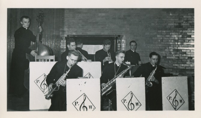 Paul loved his music. Not in this picture, but he kept on to it for some reason. "Paul Aisher and Boys", St james Major Seminary 1945-46. Sax - Charles Loler, Eddie Sipel, Paul Weisher. Trumpet - John Pikasek, Ted Loler. Base - Louise Wilawnek. Drums - Jim Kramer. Piano - Pete Eiden. |